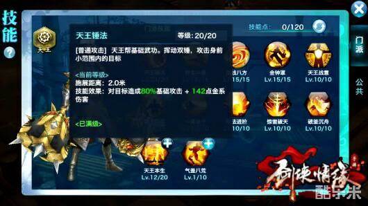 「普攻」天王帮的基础武功,挥动双锤攻击身前小范围的目标,施法距离两码。满级后能对目标造成80%基础攻击+142点金系伤害。配合上被动技能锤法进阶,进一步增加了普攻的伤害,还有惊雷破天的效果,每一次的普攻伤害都会比上一次强,当攻击六次叠满被动之后伤害是非常爆炸的。这让身为肉盾的天王也有了很不错的输出。