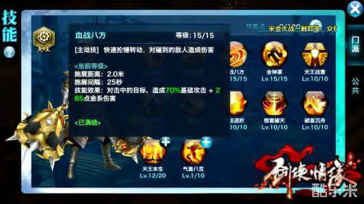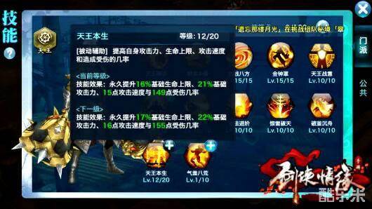 「被动辅助」全面提升「天王锤法」的威力。满级后提升「天王锤法」30%基础攻击+120点金系伤害。再次提升天王的基础攻击,并附加大量的金系伤害。和天王战意的双重攻击增幅下,让天王的攻击力是非常恐怖的。