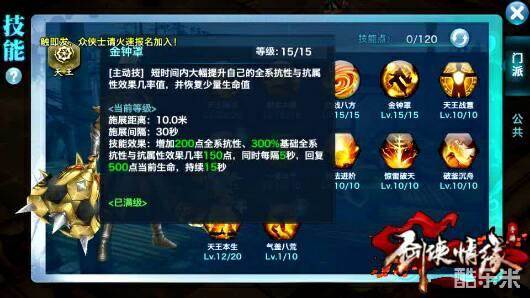 「主动技」短时间内大幅度提升自己的全系抗性与抗属性效果几率值,并恢复少量生命值。冷却30秒。满级技能效果增加200点全系抗性、300%基础全系抗性与抗属性效果几率150点、同时每隔5秒回复500点当前生命,持续15秒。天王的核心防御技能,本来自身抗性就不低,金钟罩使之进一步的增强,而且能恢复生命值,让天王的生存能力大大增强。