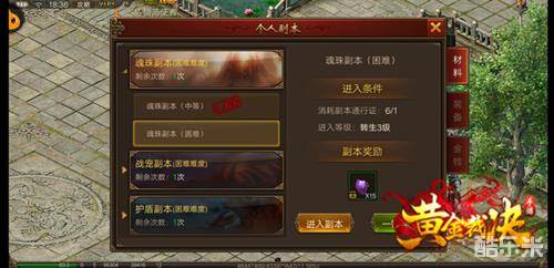 材料不够不用愁,赶紧来打材料副本吧!每天前往副本使者处可以进入材料副本,成功通关可获得海量材料,翅膀,龙魂,圣盾不是梦!每种类型的副本均有挑战次数限制,务必好好珍惜哟!