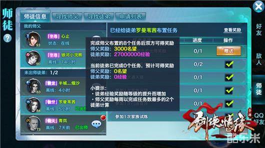 现在全新的师徒任务的任务选项共有12个,师傅可以选择其中八个安排给徒弟,徒弟完成并汇报之后,师傅获得大量名望,徒弟获得大量经验。
