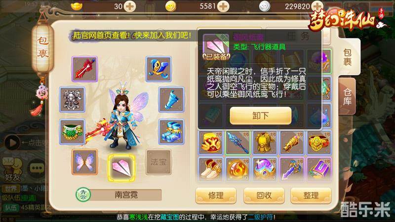 飞行器器具:在角色等级到达二十级时系统会赠送玩家凌云飞剑,穿戴后就可以御剑飞行了。还有一种飞行器具是御风纸鸾,玩家累计登陆两天就可以领取了,穿戴后可以乘坐御风纸鸾飞行。目前的飞行器具不是很多,相信以后会出更多的飞行器,让玩家们可以选择自己喜爱的飞行器。无论是穿戴哪一种玩家都可以成为老司机,更加快捷方便的移动。