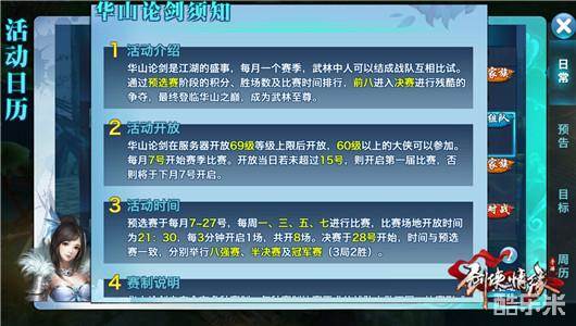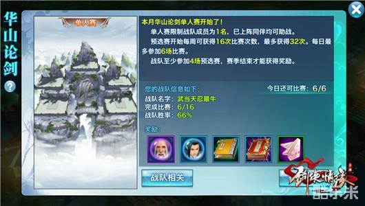 第六届华山论剑采用单人制,限制战队成员为1名,已上阵同伴均可助阵。赛期内每天最多可以参加6次,每周最多16次。共计32场比赛,最终根据战队伤敌数,比赛用时等综合因素判定胜负及名次。