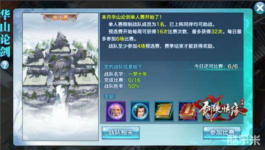 本次华山论剑采取单人PK的赛制。出战比赛时,已经上阵的所有同伴可以出场助战,将对手主角和同伴全部击败的一方获胜,如果在规定时间没有击杀对方和同伴,就以战队的伤敌数、剩余同伴数量及输出的伤害值高低论输赢。
