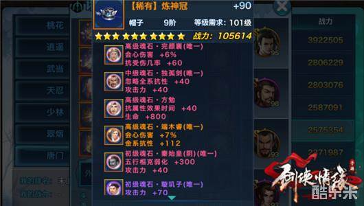 秦始皇阴增加五行相克弱化和攻击力,能有效减少宿敌武当对自己的攻击效果。没有秦始皇阴魂石可以先用方勉或者月明瑶凑合用,独孤剑增加忽略抗性还加攻击力,完颜襄跟端木睿都是增加会心伤害跟抗性和抗效果几率的,方勉是增加抗属性效果时间跟生命值,也是非常好用,但是抗属性效果时间不适合堆太多,有就行了。璇玑子魂石是开了苦痛凌绝峰以后新增的魂石,非常稀有,可以暂时用方勉代替。