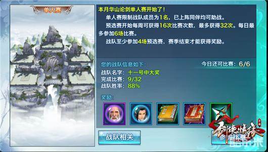 本次华山论剑采取单人PK的赛制。出战比赛时,已经上阵的所有同伴可以出场助战,将对手主角和同伴全部击败的一方获胜,如果在规定时间没有击杀对方和同伴,就以战队的伤敌数、剩余同伴数量及输出的伤害值高低论输赢。