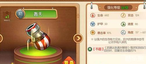 轰天的基础攻击力不高,速度也是10级武器里最慢的,但是它的生命和防御能力却远高于其它10级武器。它可以算做游戏中的坦克、肉盾吧。最重要的是它攻击地面以后轰出的地面是个半圆,被轰下去的对手在半圆中选择角度会受到限制,也算很不错的加成。推荐大部分新手使用,带上它你不单可以为队友扛下更多伤害,还可以挖坑埋对手。
