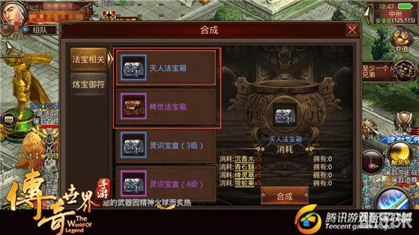 除了奇遇任务外,玩家还可以通过中州的天界使者合成法宝箱!不过这里大家需要注意一下,合成系统中有法宝箱和灵识宝盒,灵识宝盒是不能开出法宝的,大家千万不要合错了!