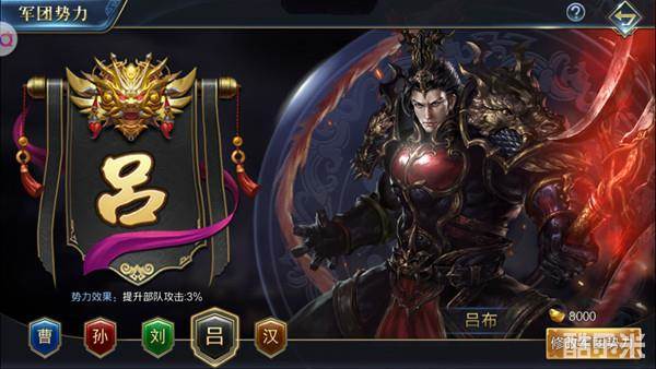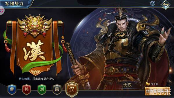 加入势力首先会有一定的属性加成,曹操势力可以提供部队生命值加成;刘备势力可以提升部队招募速度;孙坚势力提升建筑速度加成;吕布势力会提升部队攻击;汉势力增加资源采集速度。势力属性虽然不能在短期带来明显收益,但是争夺天下的过程是比较漫长的,经过长期发展势力属性可以带来较大的提升。