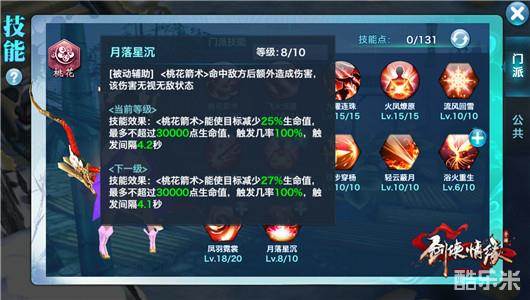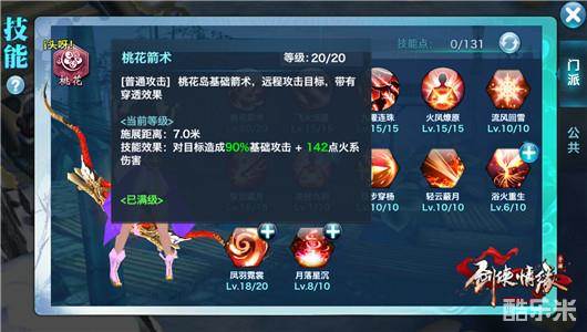 桃花箭术。【普通攻击】桃花岛基础箭术。远程攻击目标,带有穿透效果。月落星沉、百步穿杨和月落星沉的叠加可以有效加强桃花箭术的杀伤输出,对战天王等门派时掌握了更多的主动性。全部加满。