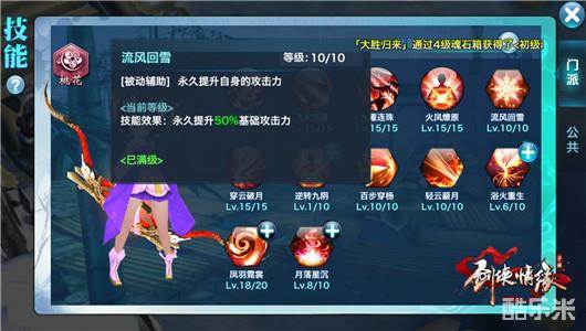 流风回雪。【被动辅助】永久提升自身攻击力。10级时,永久提升50%的基础攻击力。全部加满。