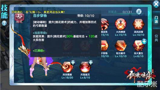 百步穿杨。【被动辅助】提升桃花箭术的威力,并增加第四式的弓箭数量。10级时,提升桃花箭术30%的基础攻击+120点火系伤害。全部加满。