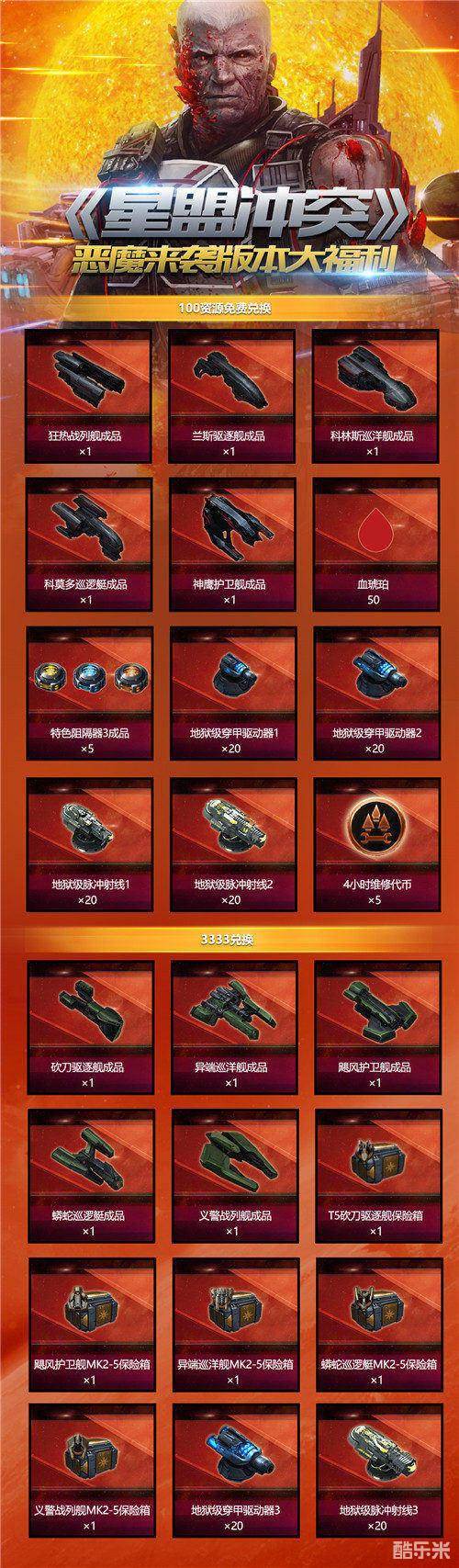 100资源兑换:科林斯巡洋舰成品X1、地狱脉冲射线1/2X4、地狱穿甲驱动器1/2X4、远射阻隔器3成品X1、4小时维修代币X1、血琥珀X10