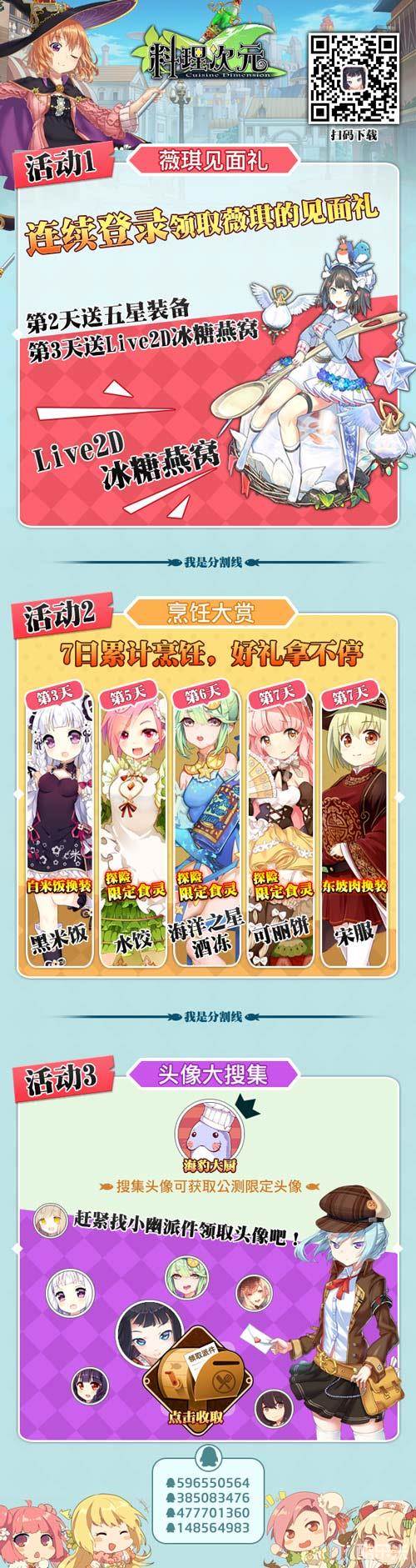 为庆祝《料理次元》测试开启,游戏精心为广大小伙伴们准备了“薇琪见面礼”、“烹饪大赏”、“头像大搜集”3大活动!不仅有五星装备、互动看板娘,还有限定食灵、食灵换装,公测限定头像等奖励……!连续登陆有福利,累计烹饪赠豪礼,搜集图像送惊喜!一大波奖励接近中,心动不如心动!皮皮虾,我们走!(ps:您的皮皮虾已被做成龙虾意面)