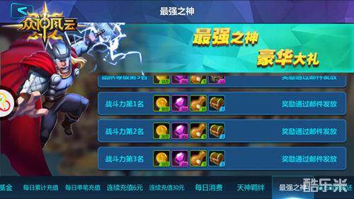除了让人目不暇接的珍品外,还有特殊的大礼让你瞬间扬名服务器。集战力与智慧于一身,最强之神就是你!在通天塔、竞技场、上古魔神,战力榜中获得前三名的玩家可获得特殊大礼!排行第一名的玩家将成为该服务器的最强之神,名扬大荒!