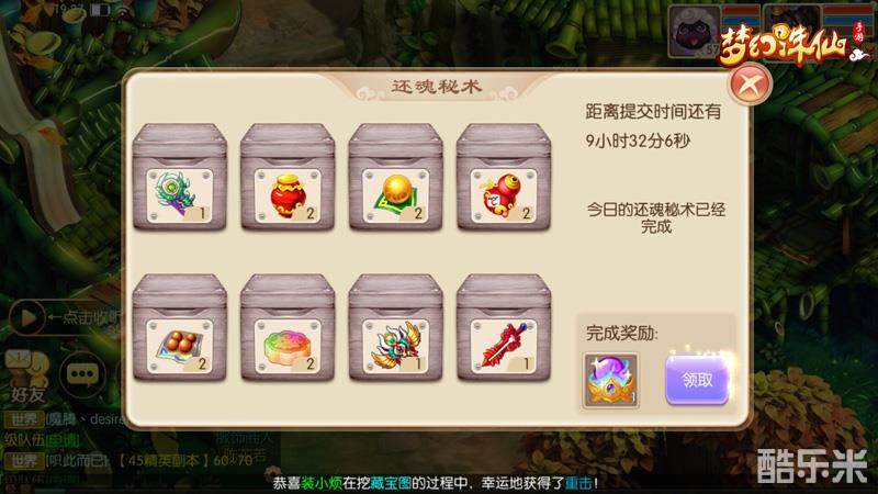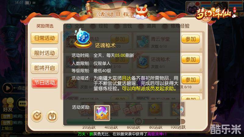 还魂秘术是单人日常活动,活动需要帮南疆的大巫师吕达准备8种祭品,来帮助吕达尝试复活碧瑶,每收集齐一种祭品,就可以获取一定的经验,完成全部祭品收集就可以获得大量的修炼经验和奖励。既可以完成英雄救美,还可以获取奖励,恨不得一天多参加几次,可惜这是日常任务,一天只能完成一次。