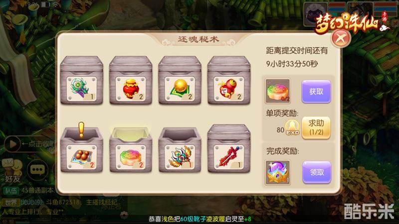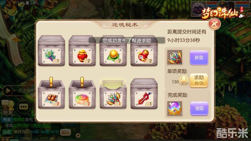 还魂秘术的完成时间是有一定限制的,没有按时完成祭品收集是无法获取最终奖励,另外自己完成五种祭品的收集还有两次求助的机会,可以让帮派成员帮助自己完成祭品收集。