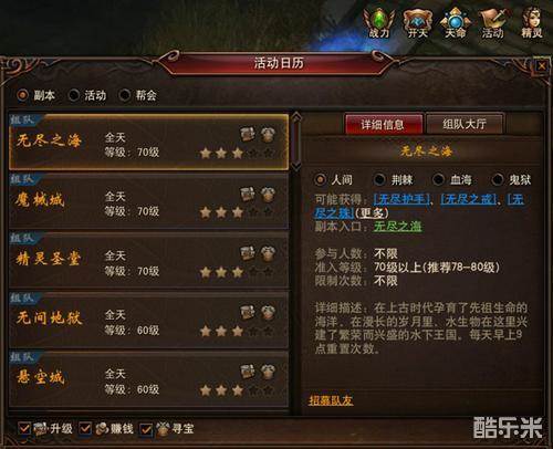 随等级提升,可以挑战不同的副本哦,副本中点击右上角,场景名字左侧的按钮可以直接离开副本.具体可在活动日历里面查询。