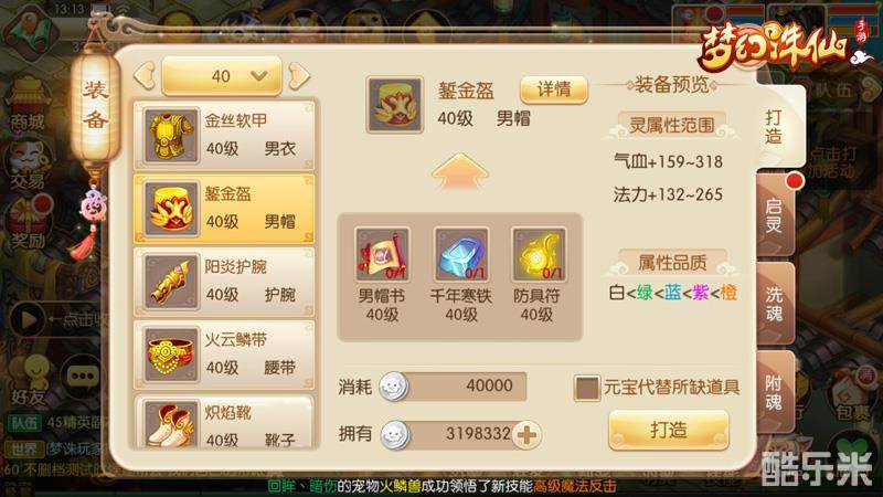 打造材料:首先需要的当然是装备了,装备都没有怎么打造装备啊。其次就是一些附加材料,不同的装备需要的材料也各不相同,但是这些材料都是比较容易获取的,可以通过商会、乱世妖魔和藏宝阁等方式获得。最后需要的就是银币了,有钱好办事嘛,自然打造也需要消耗一定的银币。