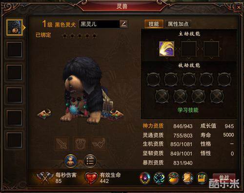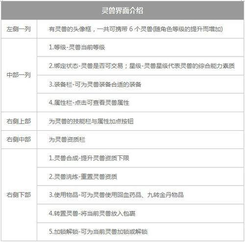 一只灵兽最多可以获得3个主动技能以及9个被动技能。在灵兽属性面板,可以查看到灵兽的资质、寿命等内容,资质越高代表着灵兽的属性越好,可以通过使用药品来补充灵兽的寿命。还可以查看到灵兽的等级、名称、星级、形象、基本属性数值等等,一只灵兽最多可以装备三件装备,分别是武器、防具、饰品。