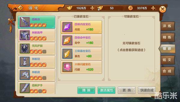 宝石镶嵌提升的战力相当可观,宝石可以通过每日签到、主线任务以及商城购买获得,低等级的宝石还可以通过合成强化成高等级的宝石,一套高等级的宝石加的属性可以与一件稀有装备相媲美了,不过由于高等级宝石入手难度较大,还是推荐优先装备淬炼。