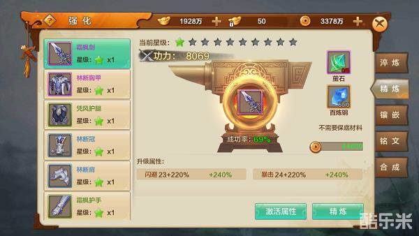 当玩家等级达到70级之后就会开启装备精炼啦,装备精炼需要消耗萤石,且有一定几率会失败,精炼等级越高的装备强化失败率越高,使用百炼钢能使得装备精炼失败不掉星。萤石相对来说入手较为简单,装备副本、铁掌峰、商城都可以获得,而百炼钢入手难度就比较大了,只能通过商城购买或者师德值兑换。由于强化几率不稳定,所以收益优先度不如装备淬炼和宝石镶嵌。