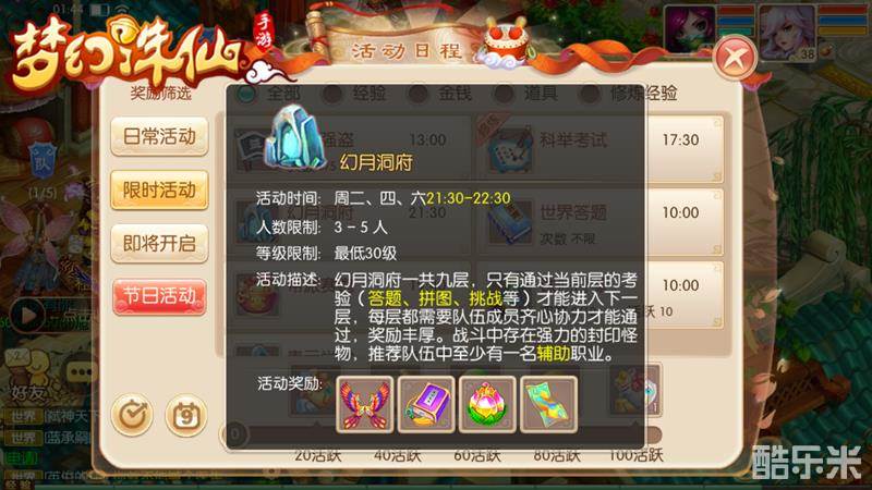 幻月洞府会在每周的二、四、六的21:30-22:30开启,在活动期间,达到30级的玩家点击活动日程里的限时活动便可在显眼处找到并参与。此副本有大量经验及丰富道具奖励,机智的小伙伴们可不要错过哦。