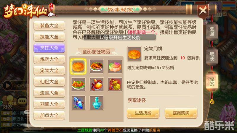 接下来是烹饪技能,此技能可产出宠物食品及酒类。宠物食品可增加宠物的寿命、增加饱食度,而酒类则有增加自身怒气和使敌对陷入不利状态的功效。宠物食品、酒类产品,都是居家旅行,杀人越货之必备良品,人畜皆宜,你值得拥有!