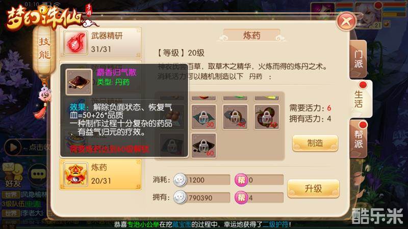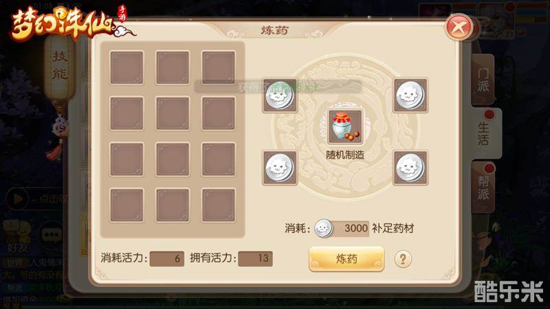 炼药技能,药品的重要性相信不用小编多说了,产出药品有恢复气血、法力的功效,等级高的话,还能产出有增益buff的圣药!学习炼药技能,相当于有随身的补给、移动药罐,好处不言而喻!值得注意的是,和烹饪技能一样,炼药技能产品的产出不可控,产出普通药品或圣药,都要看人品啦!不过无论产出啥药品,都能摆摊卖得好价钱,大量银币滚滚来!