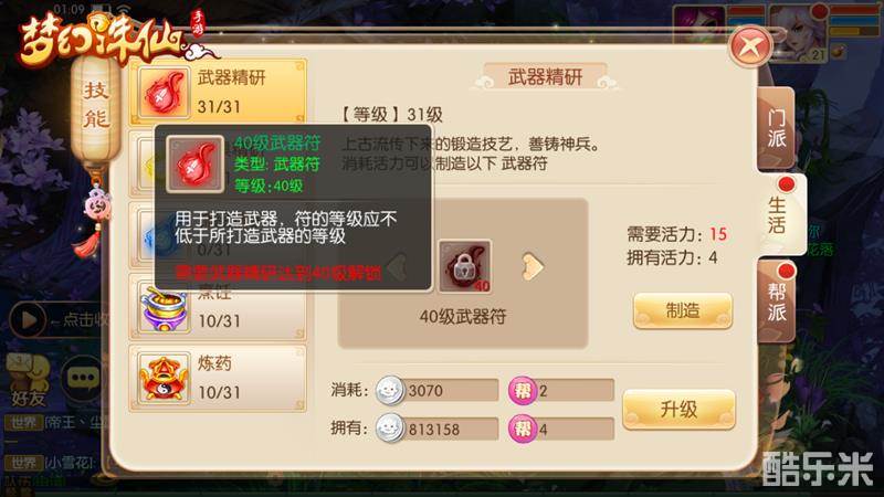 当玩家等级达到17级以上(含)时,点开技能便会多出“生活”一栏,到时各种生活产品便从这里产出啦。每项生活技能都有多种产品,只要将其升到产品要求的等级,便有机会轻松获得。每升一级技能,都要消耗一定的银币,而升到30级后,继续升级还需消耗一定的帮贡。虽然升级生活类技能需要花费银币和帮贡,但是掌握了生活类技能后,便可以有效的将身上的活力变现为银币,付出都是值得的哈!