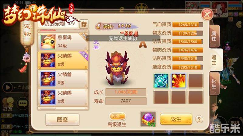 返生:宠物返生后变为0级,资质技能重新随机获得。高级返生为变异宝宝专属,开启后必定返生为变异宝宝。专有宠物、魔兽和神兽不可返生。
