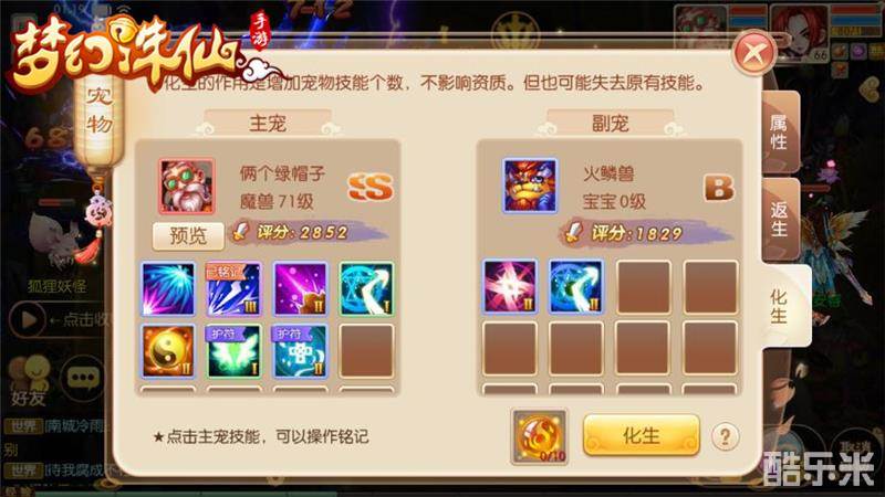 化生:两只宠物合成为一只宠物,主宠为合成后宠物,副宠合成后消失,化生时,主宠资质不变,技能发生变化。野生不能化生,化生时宠物特有技能不可继承。