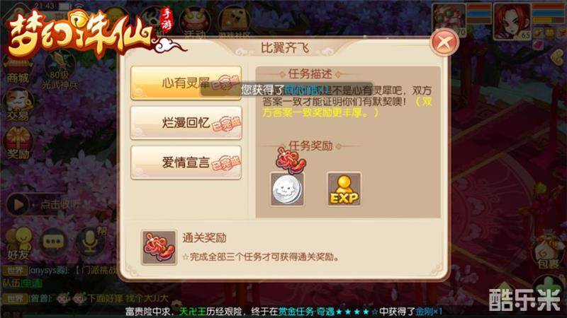 《梦幻诛仙》手游中的比翼连枝任务属于已婚玩家专属任务,只有在月老处喜结同心的玩家才能体验。顺带说一句,结婚可是需要足够的亲密度。比翼连枝任务每日刷新,每次刷新3个,完成之后可获得海量经验收益,3个任务全部完成后,还能获得额外通关奖励“同心结”,同心结可用于提升亲密度。