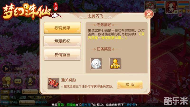 考验夫妻双方默契度的任务,这是答题类任务,一方接取另一方同意后双方同时进入问答流程。在回答问题时,无论选择何种答案都可以获得奖励,只不过双方选择答案一致时可以获得更多奖励。