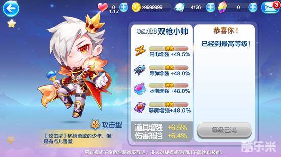速度型的角色130级可加强的四项基本属性都能显著提升奔跑速度,2项增强冲锋,还有加速带和加速能力提升。技巧型加的是护盾、章鱼、锁链、地雷,主要加的是防御能力。攻击型加的是闪电、导弹、水泡、恶魔,增强的都是攻击道具,所以最适合道具位。