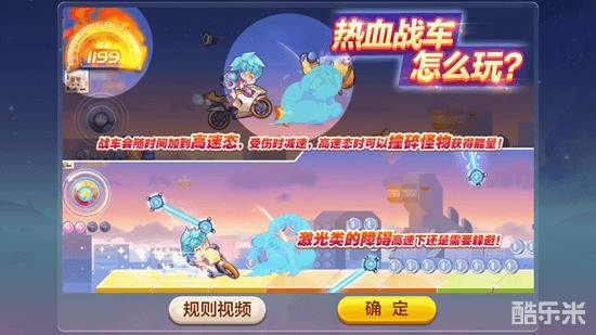 战车在赛道中,也会随着时间的增加,达到加速的状态!在加速状态下,可以无视积木,怪物等障碍物,但是激光类的障碍物,还是需要躲避。激光类障碍除非在冲刺状态下,否则触碰到之后,都会减速。使用冲刺类角色的话,最好在左侧有火焰出现,战车高速下释放,这样速度叠加,最快可以达到5000左右。