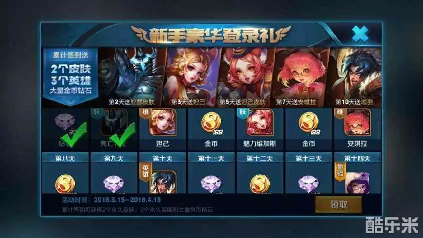 首先就是新手签到礼包,这个从开始到现在没有发生什么变化,签到十四天可以得到三个英雄(妲己、安琪拉、项羽)以及两个皮肤(死亡骑士、魅力维加斯)。