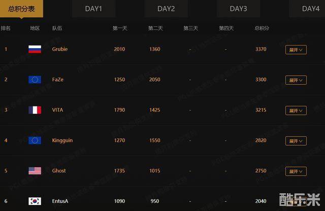 截至23号,比赛已经过去一半了,目前总积分位列第一的是来自俄罗斯的GR战队,他一度超越FAZE和VITA赶上第一,不过他们的分叉不是很大,后面还有很多超过的机会。而这2、3、4名都是欧洲的战队,第五是美国的Ghost战队,6、7名都是韩国的战队,中国成绩最好的是排在第9的OMG。