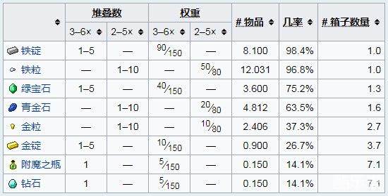 每个沉船宝箱子包含2组3–6与2–5叠物品,并伴有以下的分布: