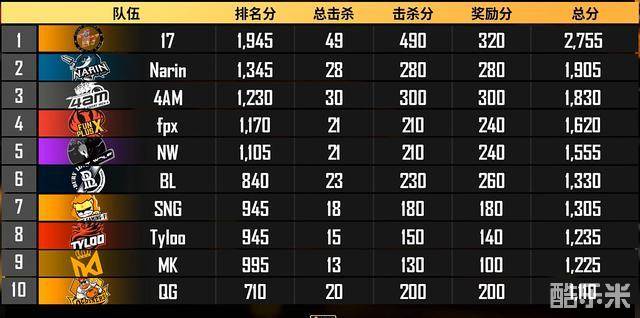 今晚的表现最佳的战队当属17战队了,17战队在第一局和第三局两局比赛成功吃鸡,不愧是拥有“刚枪王”17shou的队伍。凭借着两鸡的优势,17战队在今晚的排名当中取得了最高的排名分1945分,再加上49个人头的击杀数拿到了490分,还有最高人头击杀数的奖励分320分,17战队今晚以总积分2755的巨大优势排名第一,拿到进击决赛的名额。