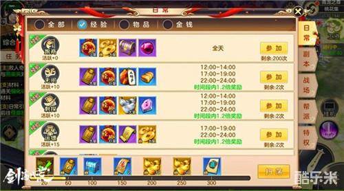 首先,《剑荡八荒》中不少玩法都为玩家提供了极为丰富的经验,包括剧情任务、经验副本、运镖、刺探,流浪谷挂机等等,分别为任务类、升级类、活动类。在游戏新手期,也就是在1-40级的时候,玩家优先完成主线和支线任务是最佳的选择,结合新手玩法教学,能够以最快最顺畅地的节奏提升实力和等级,同时了解游戏的诸多玩法,而且收获丰厚奖励,会为大家后期的成长提供基础的装备。