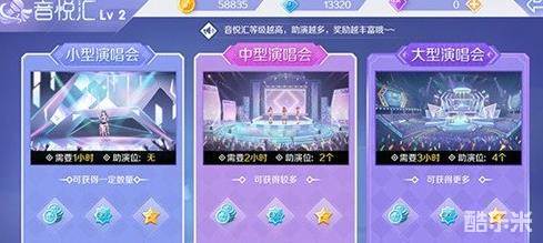 舞团中玩家可以通过音悦会开启自己的演唱会,演唱会分为小型、中型、大型三个类型,开启演唱会对应会消耗金币、点券、钻石,当演唱会完成后玩家可以获得舞团币、经验、舞团知名度的奖励,开启演唱会后需要持续一定时间,支持玩家使用点券等材料快速完成,奖励会以邮件的形式发放到玩家邮箱中。