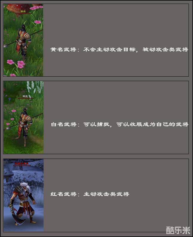 武将分为:近战型、法术型、均衡型。 武将有:白名武将、黄名武将、红名武将。