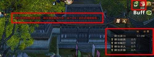 依次回答完三个考官的三个问题,将三组大屏风,每组的四面屏风上均有闪动的黑色字,即可完成第一系列的任务,获得一个1小时的“铸剑”BUFF。同时,要求你前往铸剑熔炼大师处,完成第二系列的任务“制剑”。