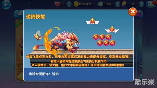 业火麒麟在多人模式下,最大速度增加35,飞星能量增加70%,开局冲锋时间加55%,超级冲刺距离加65%,钻火圈或者是集齐火印之后,都会获得加速效果,同时延长角色的主动冲锋技能。坐骑在多人对战模式中,属性是比较强大的。