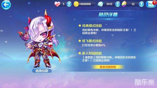 暗黑伯爵是限时活动角色,玩家只能通过黄金奖池来抽取获得。酷跑国中的许多角色都是单一的技能形态属性,而暗黑伯爵是第一个拥有双形态的暗影王者,同时拥有冲刺与冲锋技能,三段跳之后滑翔,掌握暗黑伯爵的技能操作要点之后,很容易操作上手。