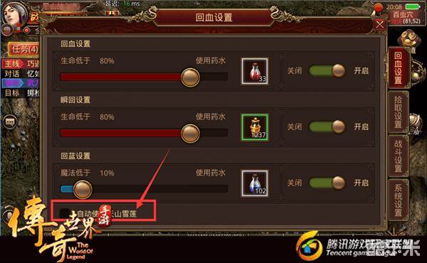 在回血设置界面的左下角,玩家往往没有注意到,其实这里有一个选项:自动使用天山雪莲!这个选项其实主要是针对挂机、自动战斗等玩法,玩家选择开启后,可以自动使用天山雪莲,提高自己的回复能力。如果你是在某个地图挂机升级,那么千万不要忘了勾选这个选项哦!