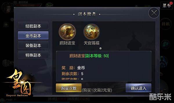 扛着大刀站在金钱鬼面前,小编决定自力更生,赚钱去。在《皇图》中,身为一个战士,背包里没点银子怎么好意思出去勾搭妹子。《皇图》中的金币副本是唯一能够产金币地方,在等级升到50级后,便能进入金币副本赚钱了。