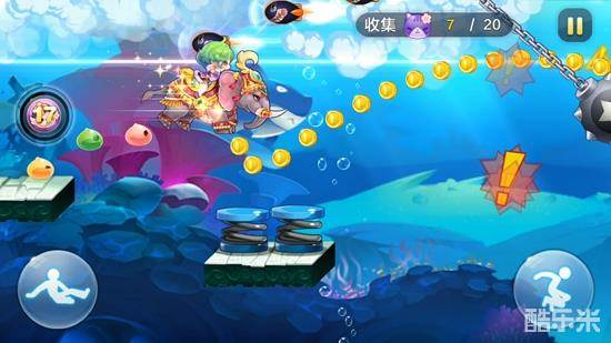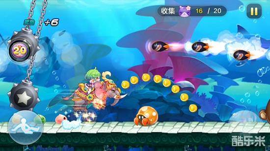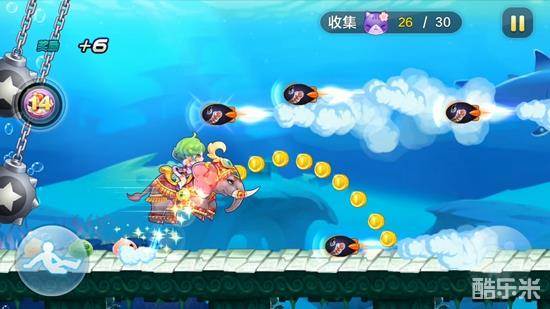遇到大量障碍时不要紧张,像摆锤出现前会有提示,可以判断出线路。建议在闯关过程中,多下滑,能避开很多突然出现的阻碍。本关的弹簧较少,踩上去后无需操作,落点安全。前方是坑且即将出现摆锤时,跑到坑边先别跳,落坑后到达钱币最低点时跳一下,就能落到对面跑道。