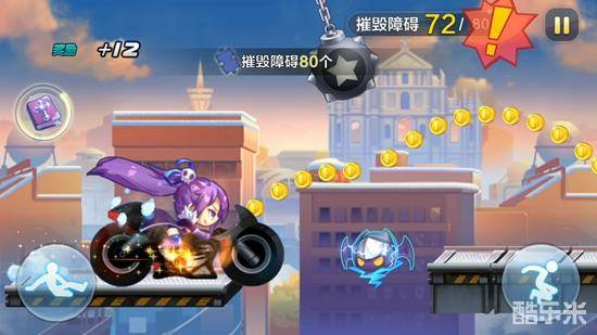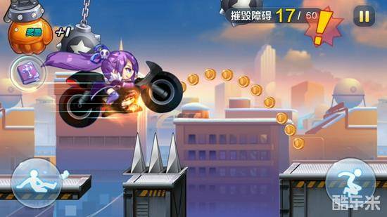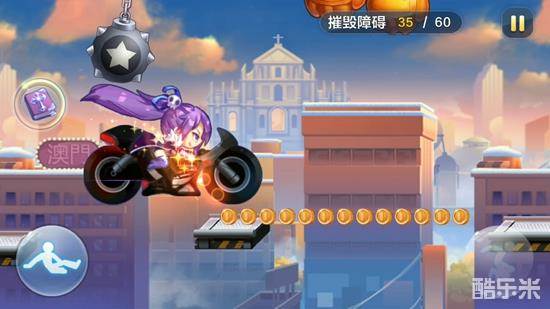 摩托的手感和其它坐骑有很大区别,建议有摩托的玩家先在常规模式中体验一番,再来进行挑战。本关也有很多大摆锤,因为有巨化道具,所以可以直接无视,还可以主动撞上去增加破障数量。开局后就能吃到巨化道具,全程都可以处于巨化状态。